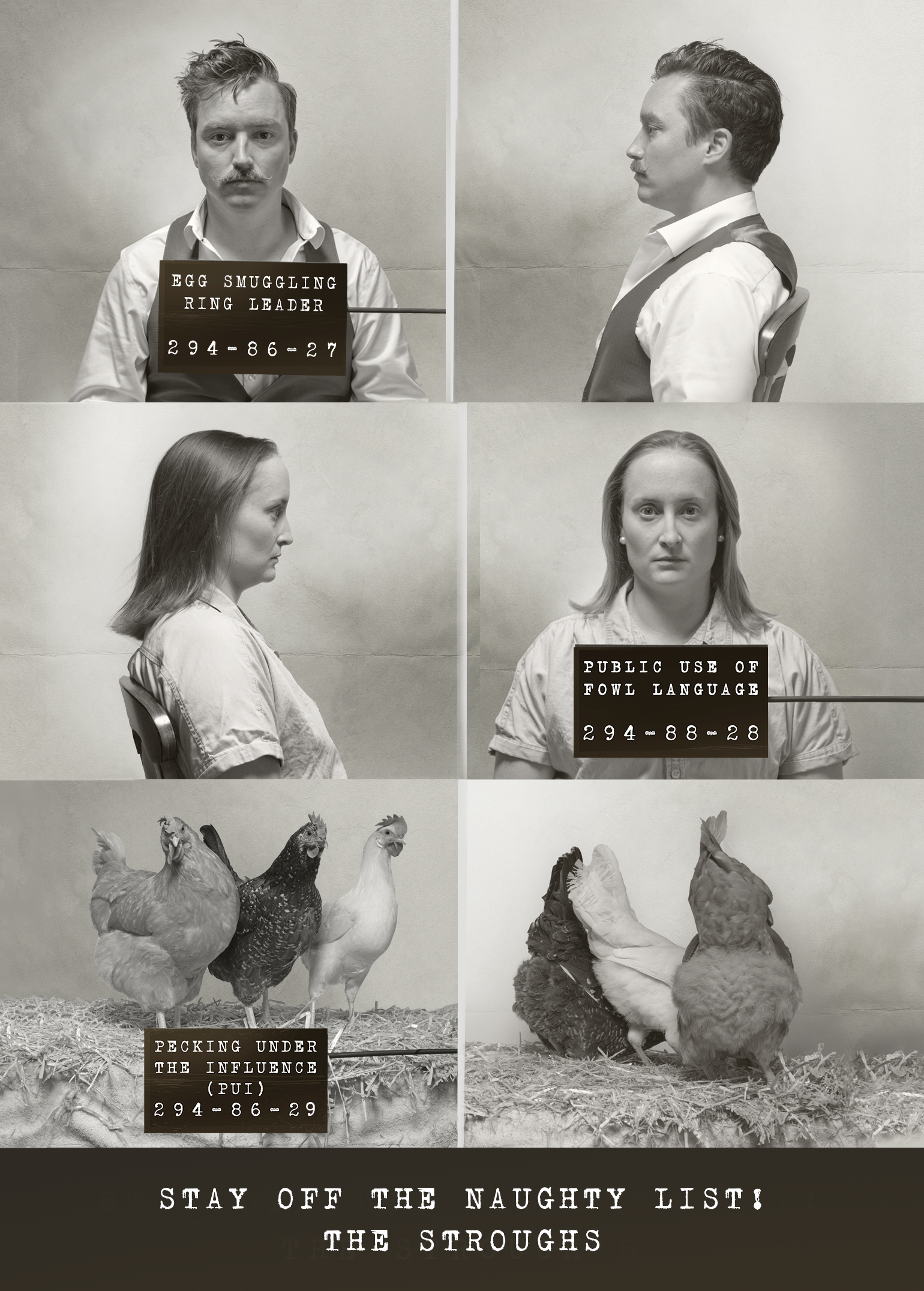 Every year they try to outdo the last, and this season’s card is no exception. We went all-in on a “chicken-themed criminal mugshot,” complete with absurd charges to match: Egg-Smuggling Ringleader, Public Use of Fowl Language, and Pecking Under the Influence (PUI). They topped it off with their signature sign-off: “Stay Off the Naughty List! — The Stroughs.”